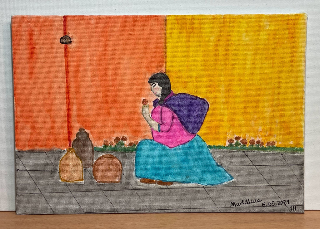 Original Acrylic and Watercolor Painting on Canvas Artwork "Cortando Una Flor” or “Picking Up a Flower” by MartAlicia 100% Handpainted Folk-art